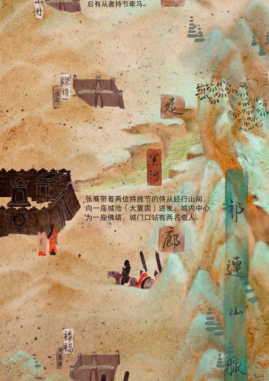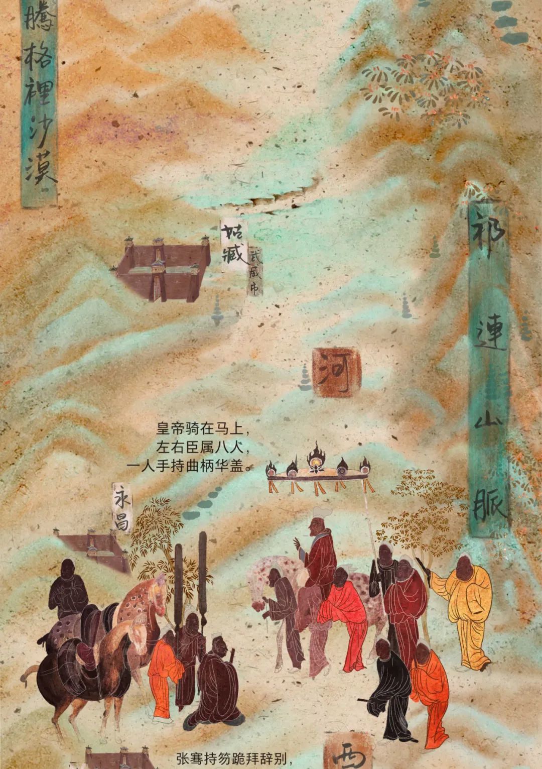 《张骞出使西域图》表现的是汉武帝获得匈奴祭天金人和张骞出使西域的情景。丝路联通后,便成为了沟通亚欧大陆最重要的陆上交通通道,敦煌作为交通枢纽功不可没。