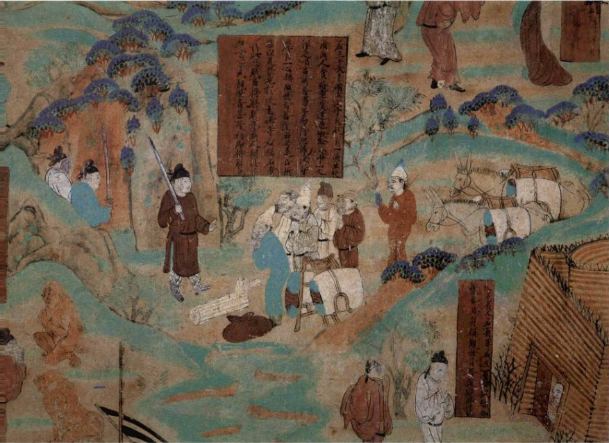 《胡商遇盗》表现的是在丝路上从事商贩贸易的胡商被汉匪打劫的故事。在这丝绸之路上,贸易活动沟通了大陆上各个角落的文明,彼此互相交融,此画从另一个角度展示了历史的真实。