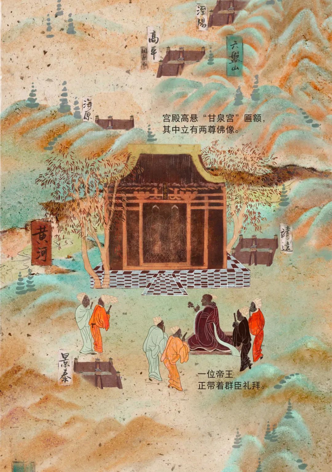 《山间行旅》表现的是印度僧人佛陀波利巡礼中国的五台山时,遇到了文殊菩萨化现的老人。受老人的开示,佛陀波利重回印度,取来《佛顶尊胜陀罗尼经》,并在中国翻译流传的故事。印度作为佛教的起源地,兴起后不久,即向四周传播,其中一条线即沿中亚传入西域至敦煌,再入中原。